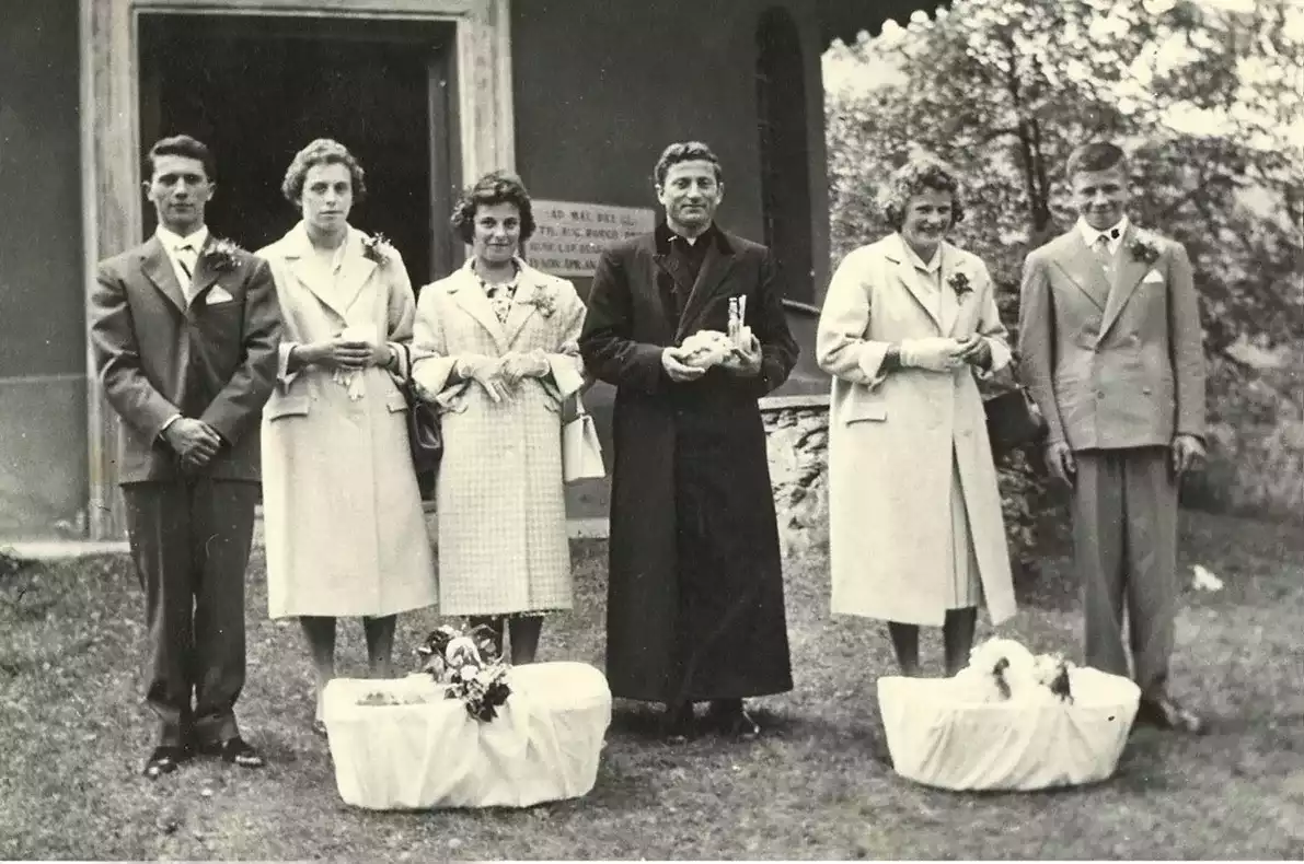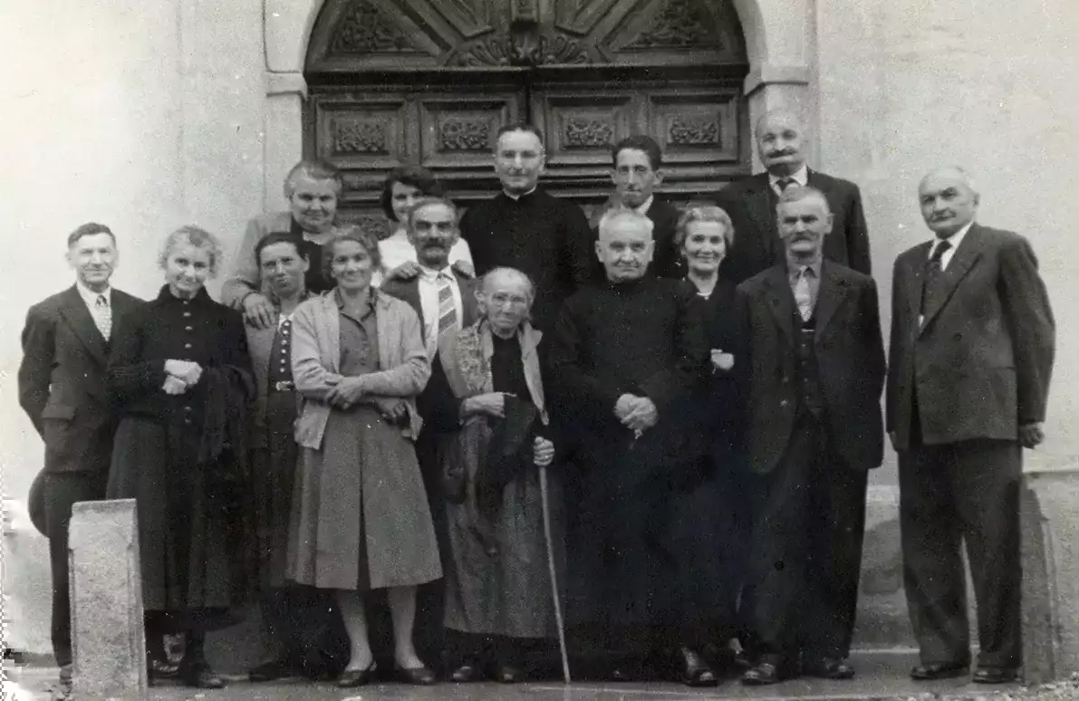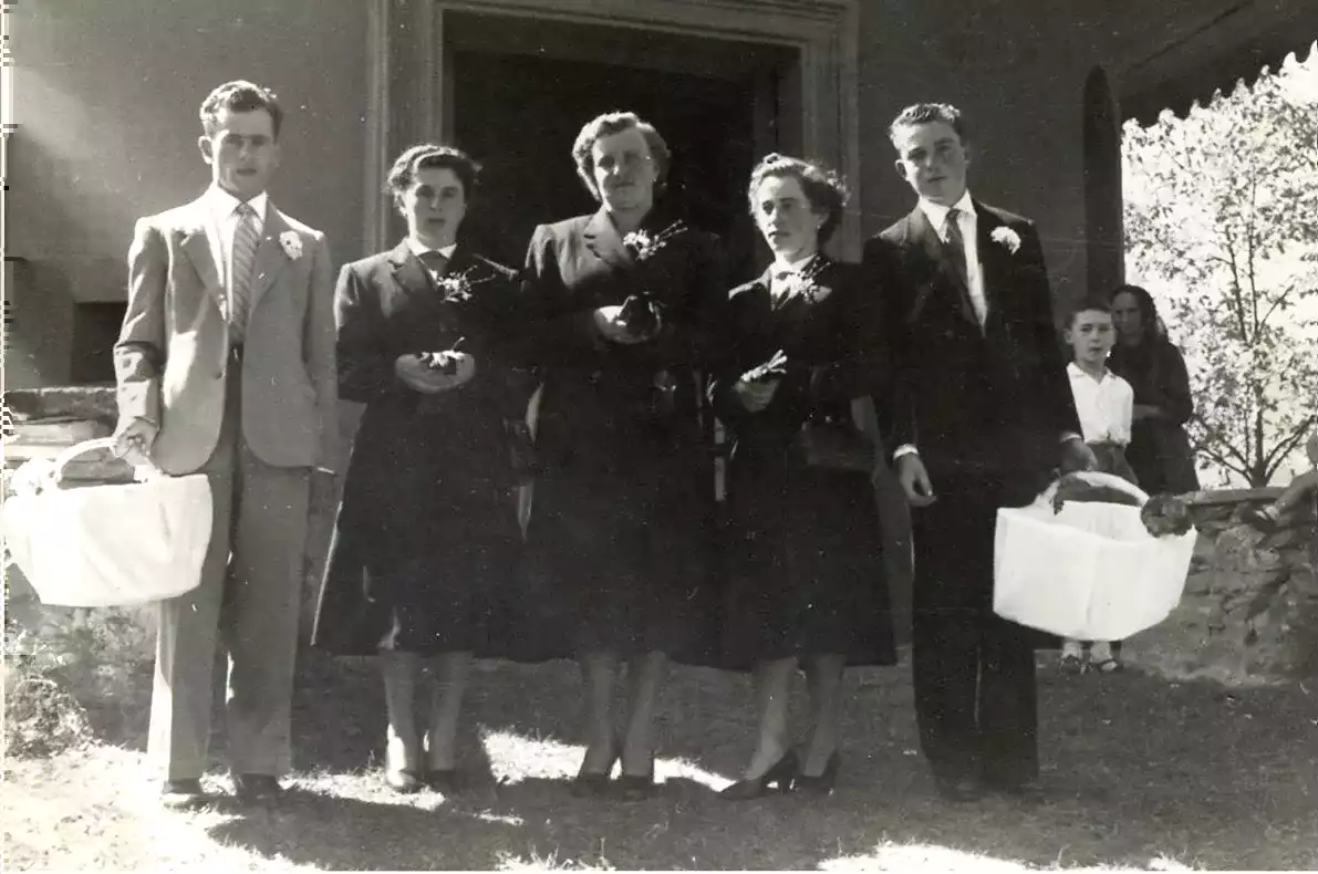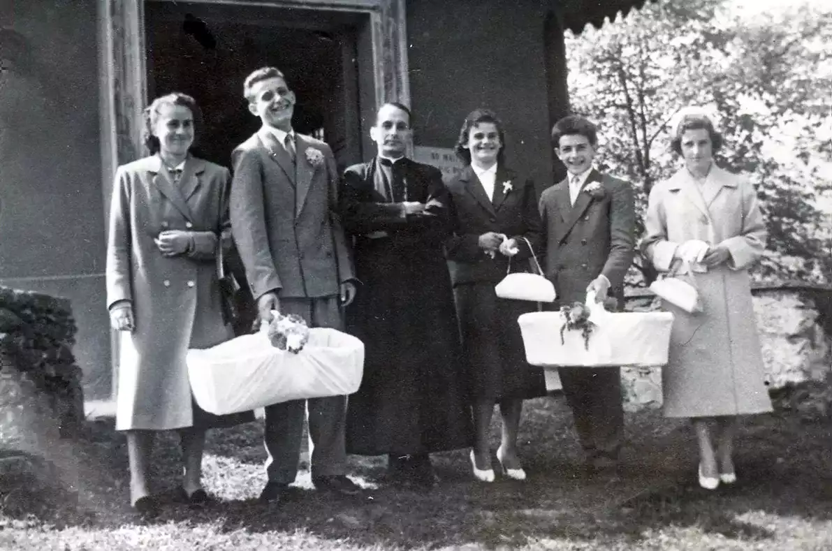 Anni '50, Priori della Grata. Da destra: Salvino Teresa, Giovanni Salvino, Michelina Gava, don Giuseppe Usseglio, Ettore Gava e Luisa Ubaudi
